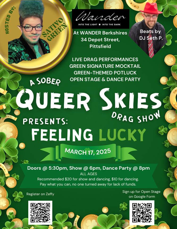 March 17, 2025Celebrate St. Paddy’s Day and all things green with the fabulously not-so-mean but oh-so-green Sativo Green at WANDER! This sober, all-ages drag show now comes with a dance party and potluck! With DJ Seth P on the beats, enjoy dazzling performances under vibrant green lights, sip a special green mocktail, and bring a green-themed dish to share. Feeling bold? Step up to the open stage and shine!