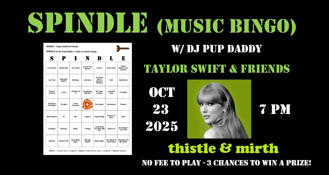 October 23, 2025Pup Daddy Productions & Thistle & Mirth team up to bring you a monthly Thursday night game of SPINDLE (music bingo) w/ DJ Pup Daddy.