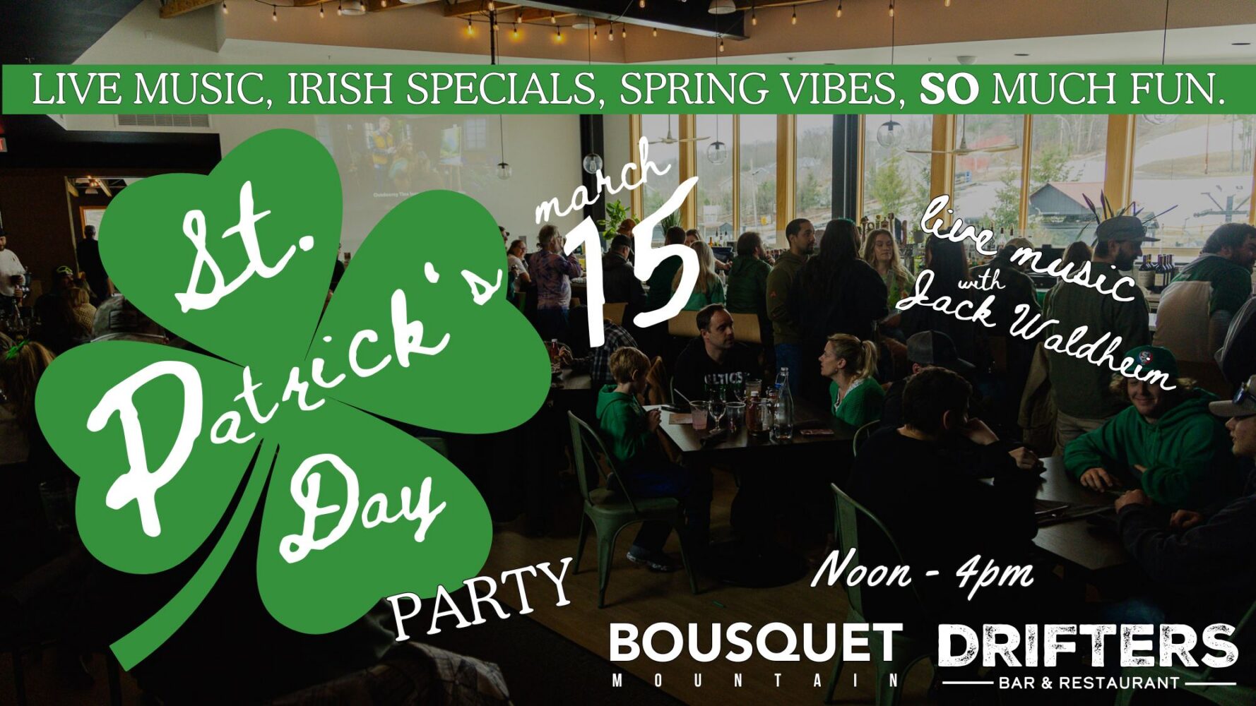 March 15, 2026Spring skiing just got a little more festive. Join us on the mountain for our St. Paddy’s Day Party featuring live music with Jack Waldheim, delicious Guinness, Irish specials, and plenty of green. Whether you’re après-skiing or just coming to celebrate, don’t miss the craic. Wear your green and get after it!