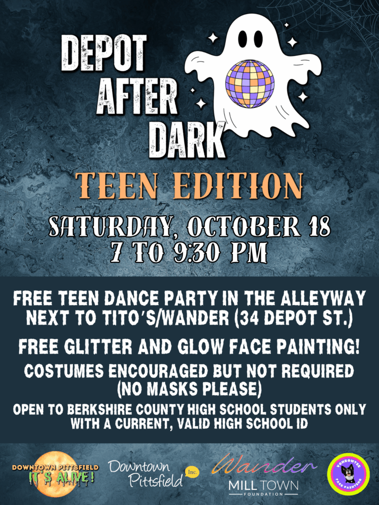 Depot After Dark: Teen Dance Party Edition! will be held on Saturday, October 18, 7 to 9:30 pm, on Liberty Street (the alleyway between Tito’s/Wander and Crawford Square). Depot After Dark: Teen Dance Party Edition! is open to Berkshire County high school students only, and attendees must have a current, valid high school ID. This event is […]