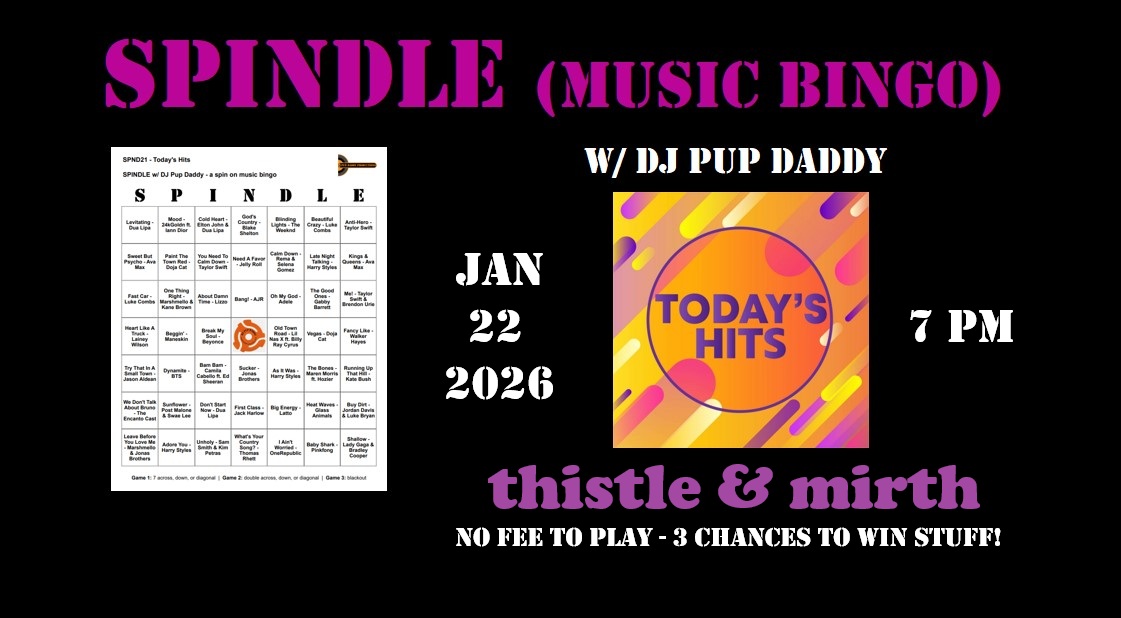 Pup Daddy Productions & Thistle & Mirth team up to bring you a Thursday night game of SPINDLE (music bingo) w/ DJ Pup Daddy. The music theme for the January 22nd game is Today's Hits! DJ Pup Daddy will randomly play 1-2 minutes of a popular jam from the past 5 years or so and […]