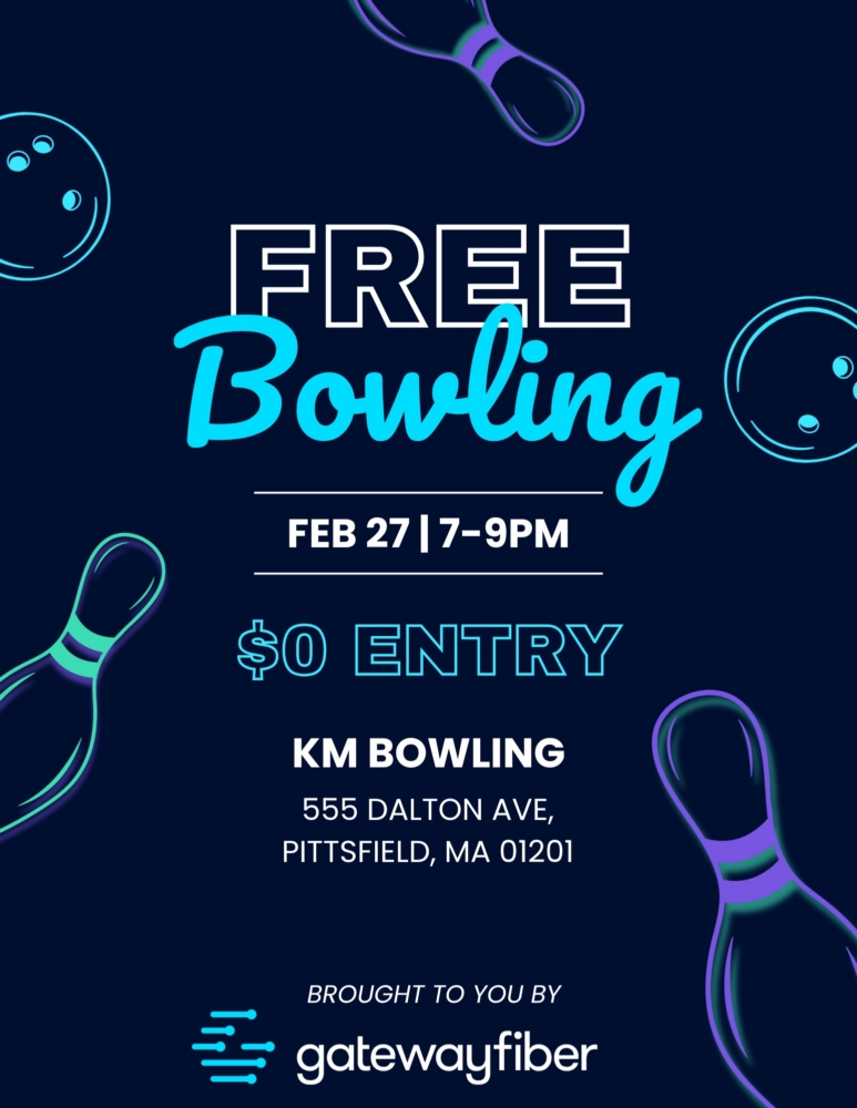 Come join us for a free bowling night. Please have a minimum of 2 bowlers per lane for a 1 hour time slot at 7 or 8 pm. This is a first come, first serve event, reservations will not be accepted. This event is being hosted by Gateway Fiber